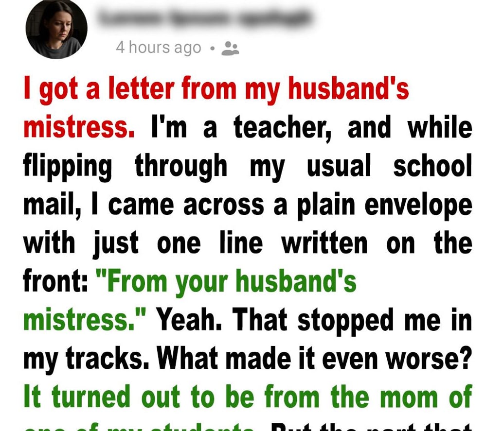 Monday mornings at school smell like dry-erase markers and someone’s forgotten lunch. I was sorting through the usual pile — supply catalogs, district memos — when I found it near the bottom. A plain white envelope. My name in handwriting I didn’t recognize. And underneath it, a line that made the room tilt: From your husband’s mistress.
