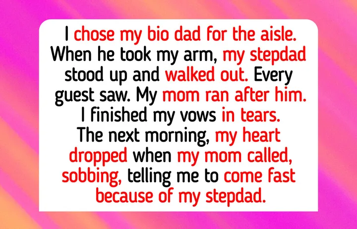 She chose her biological father to walk her down the aisle. When he took her arm, her stepdad stood up and walked out. Every guest saw it happen. Her mother chased after him. She finished her vows with tears running down her face.